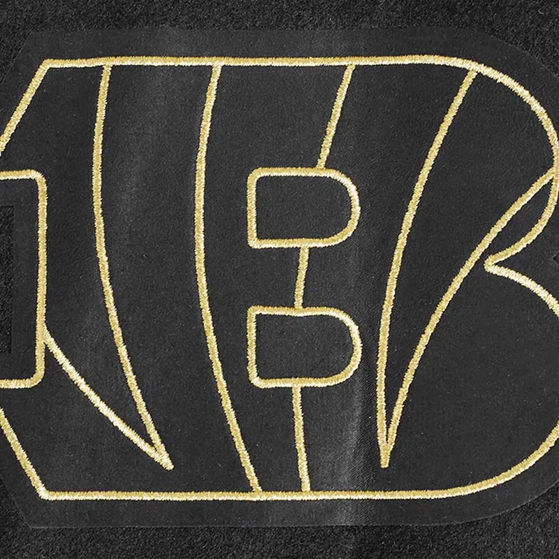 Designed with a soft viscose lining for added comfort, it features a rib-knitted collar, cuffs, and hemline that enhance its classic sportswear appeal. The snap button front adds ease and a traditional finish, while the long sleeves and two side waist pockets provide warmth and function. Whether you’re heading to the stadium or out in the city, this jacket combines Bengals pride with standout street style.