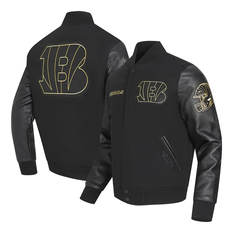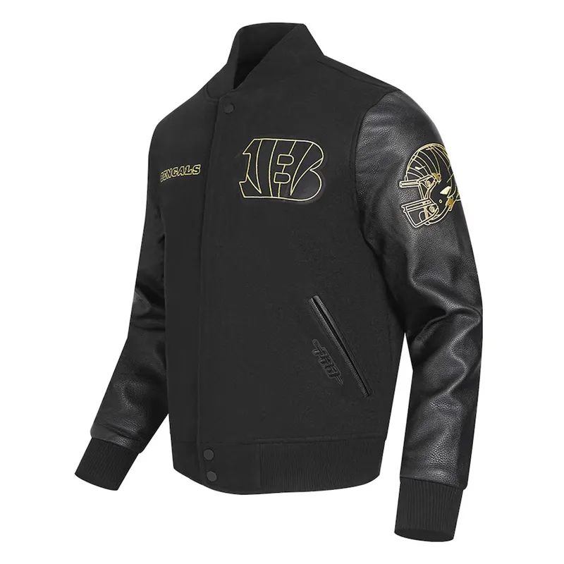 Represent your team with timeless style in the Cincinnati Bengals Full Snap Leather and Wool Varsity Jacket. Crafted with a premium blend of wool and genuine leather, this leather and wool varsity jacket offers a bold and durable look perfect for cool-weather game days or everyday wear.