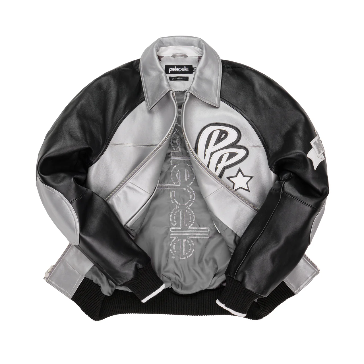 The pelle pelle soda club leather jacket is brazen and made for folks who want to pop and have their presence known. This is streetwear with a precise and cutting edge. Manufactured in America, this jacket is a fusion of black, silver metallic, and white. It melds together sharply contrasting colors and textures that command attention from almost any distance. The design is sharp, precise, and loud making it perfect for urban environments, parties, and any place you want your very being to be noticed. This is one of the best looks from Pelle Pelle’s distinctive approach to leather garments.
