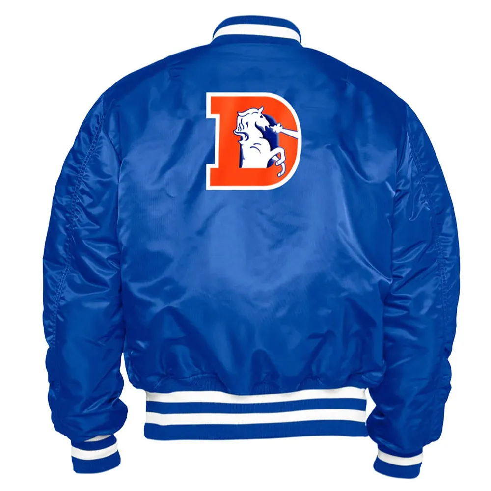 The Denver Broncos MA-1 jacket, which is made of high-quality satin, will elevate your look. Its stunning navy blue charm embraces refinement, captivates, and radiates inventiveness. With its branded YKK zipper front closure and rib knit collar, this haute couture jacket perfectly combines functionality and style for the Denver Broncos Bomber MA-1. This Denver Broncos MA-1 Bomber jacket’s viscose lining provides comfort, while the rib knit cuffs add style. Two outside and one interior pockets celebrate craftsmanship and stand for usefulness and individuality. At events, turn heads by showcasing your style and innovative thinking.