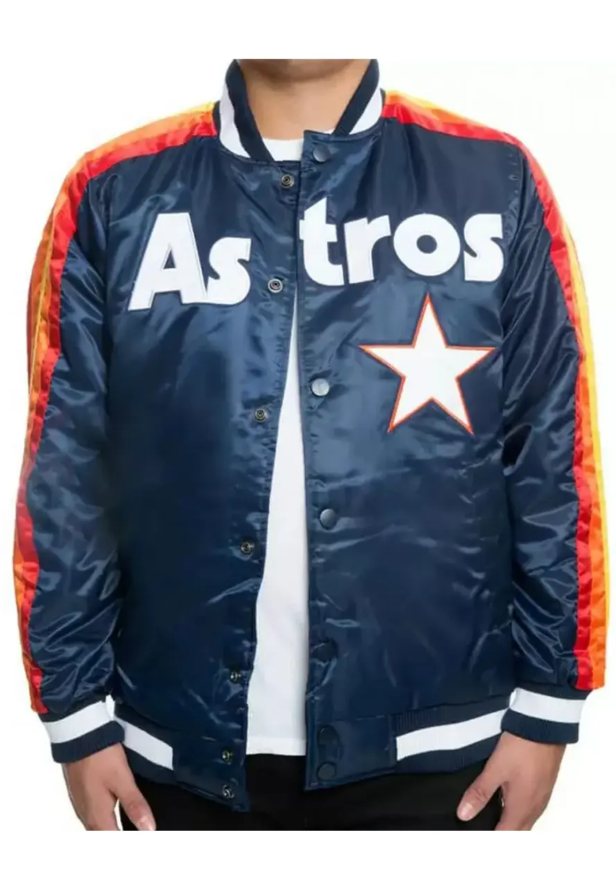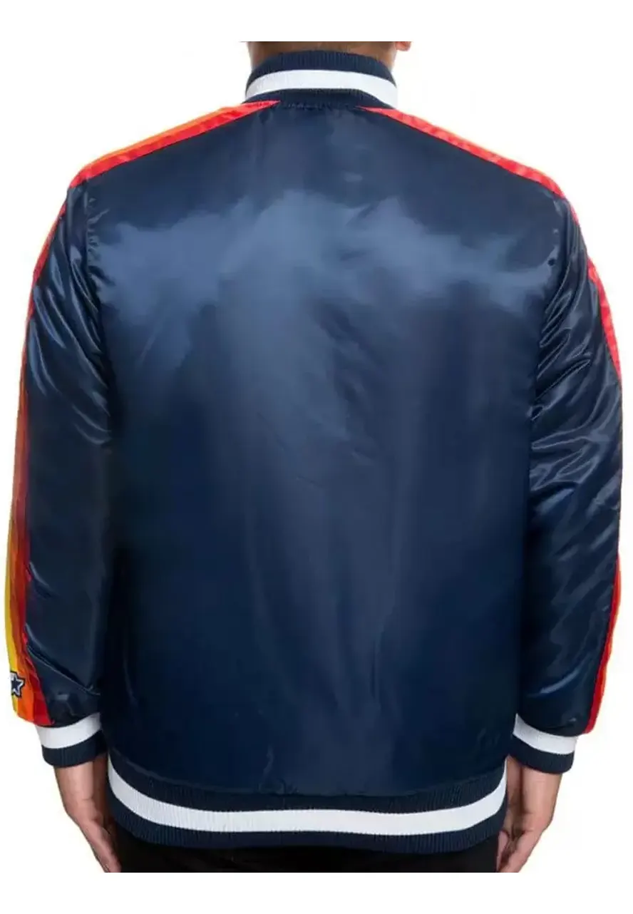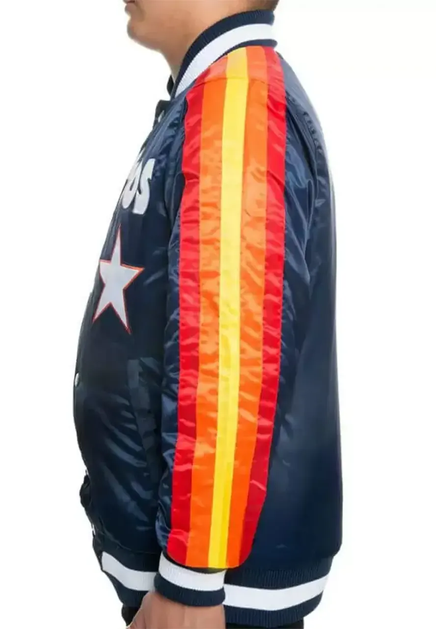 Step up your game day outfit with the Houston Astros Stripes Blue Bomber Jacket, a sleek and sporty layer designed for fans who want to stand out. Made from smooth satin with a soft viscose lining, this jacket brings a comfortable fit and a bold presence.