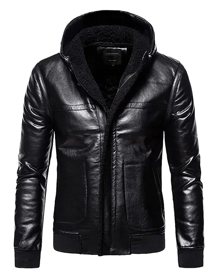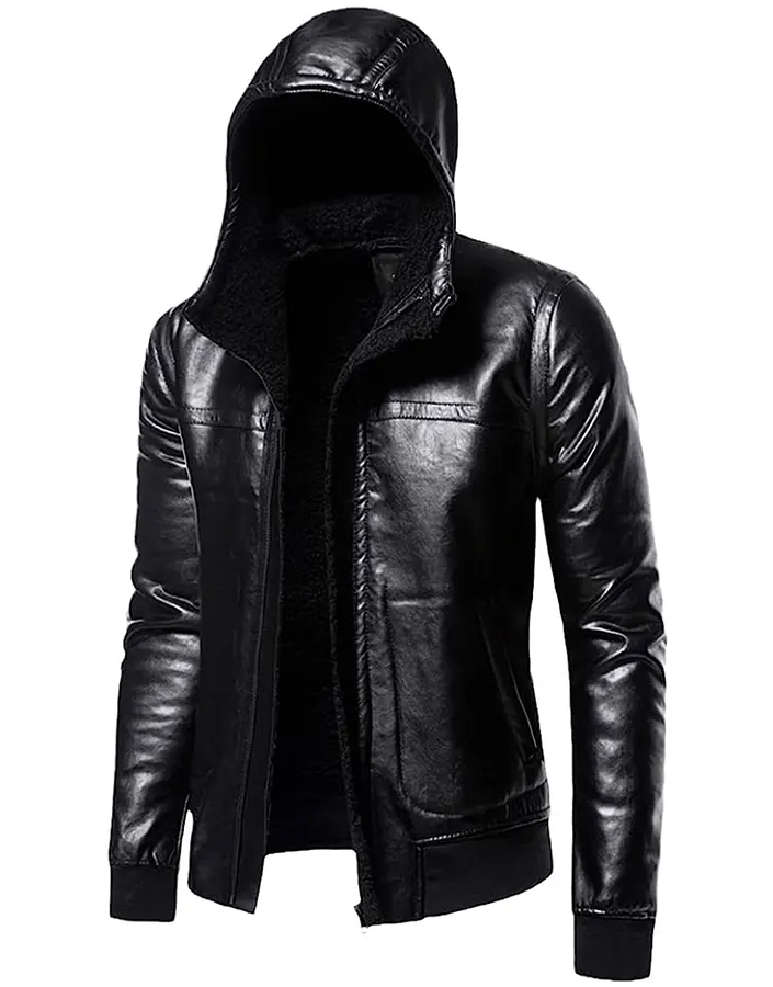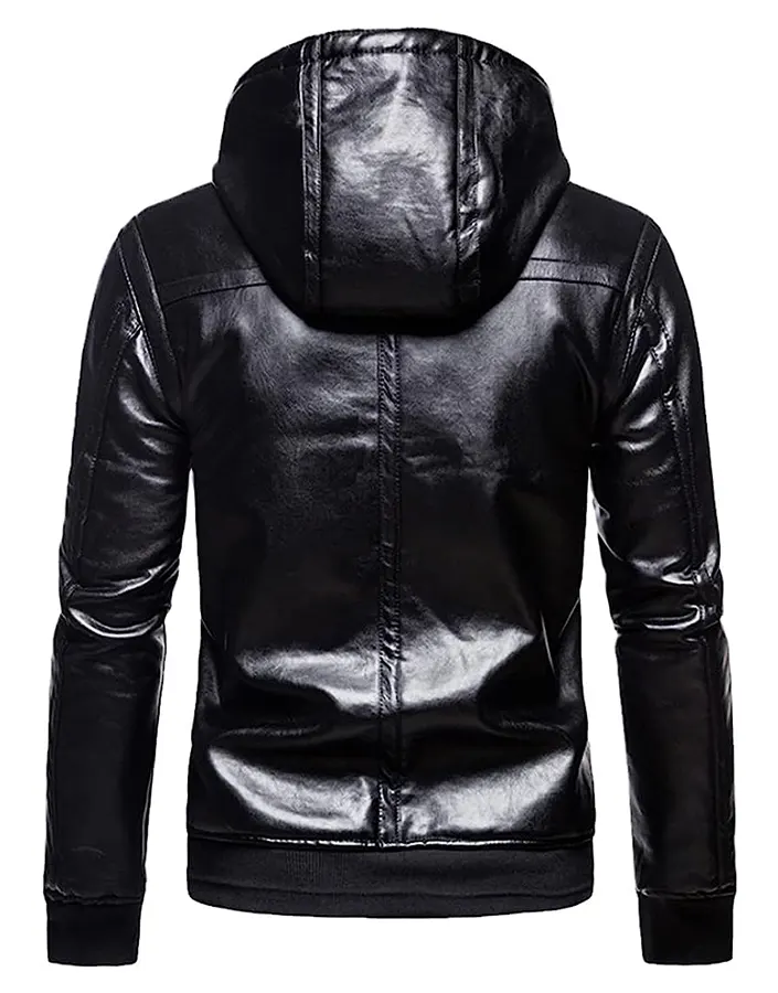 Men’s Black Faux Leather Motorcycle Jacket with Hood