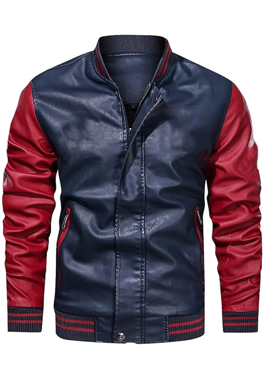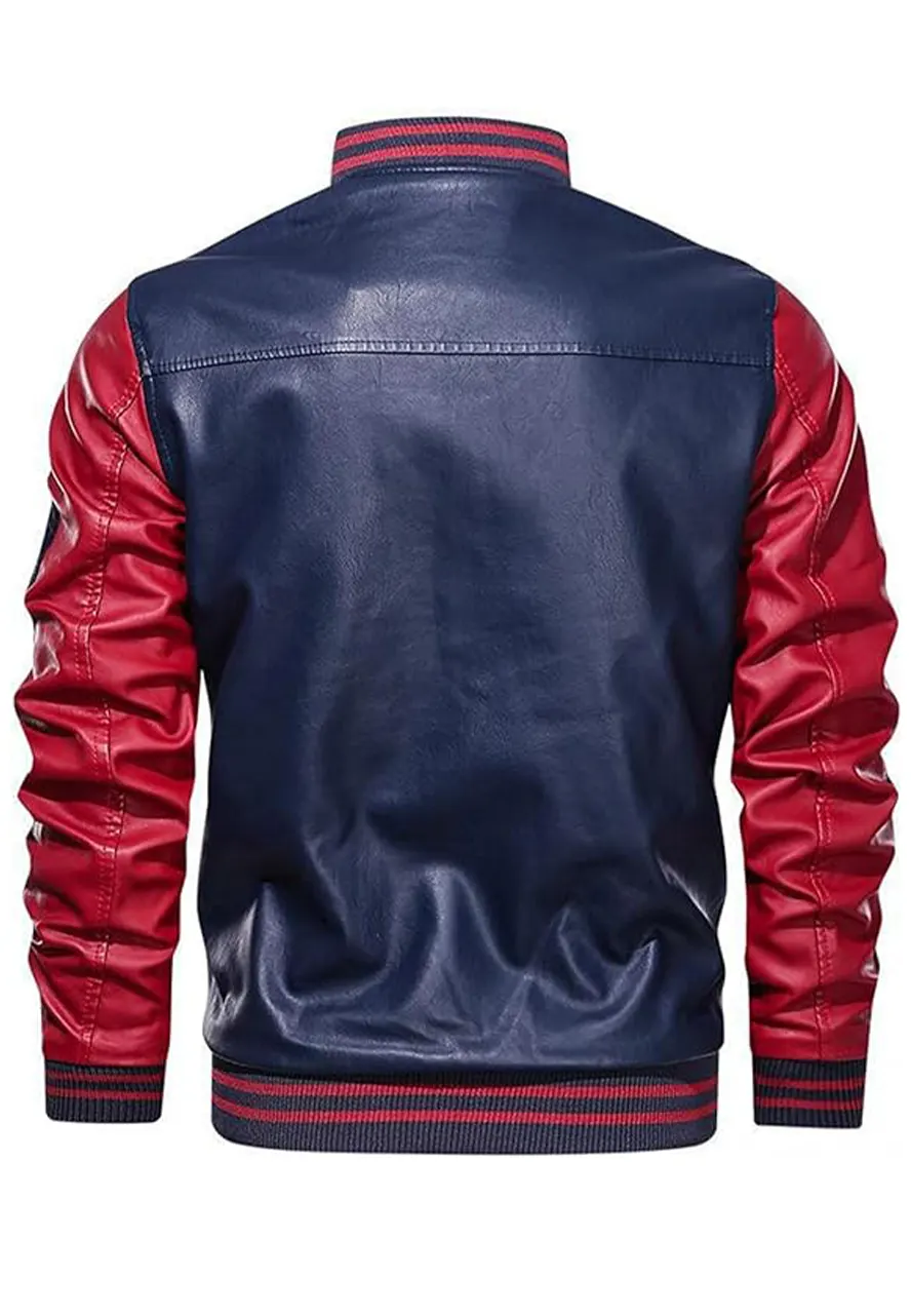 Men’s Blue and Red Faux Leather Varsity Bomber Jacket