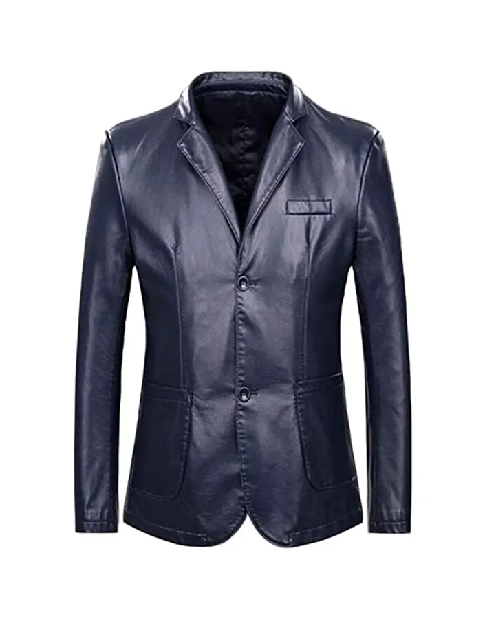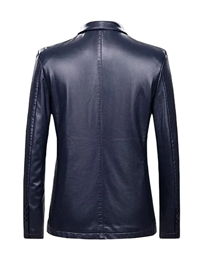 Men’s Classic Notch Lapel Collar Navy Blue Faux Leather Blazer