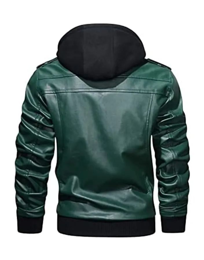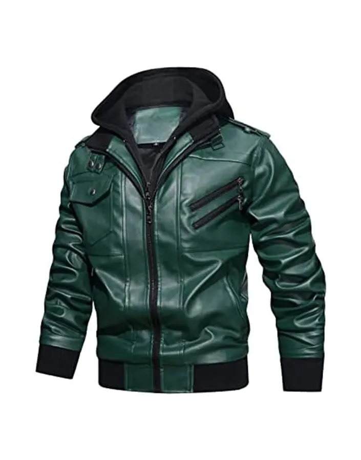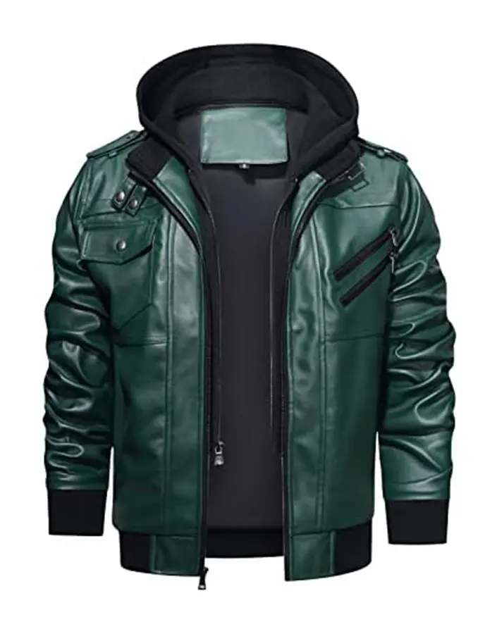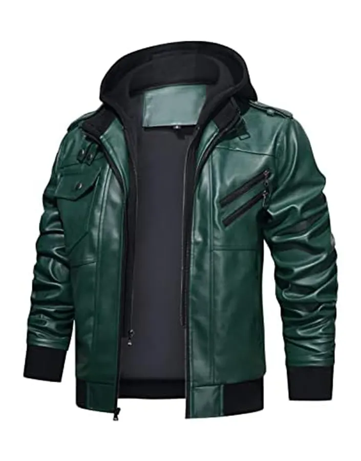 Men’s Green Faux Leather Bomber Jacket with Removable Hood