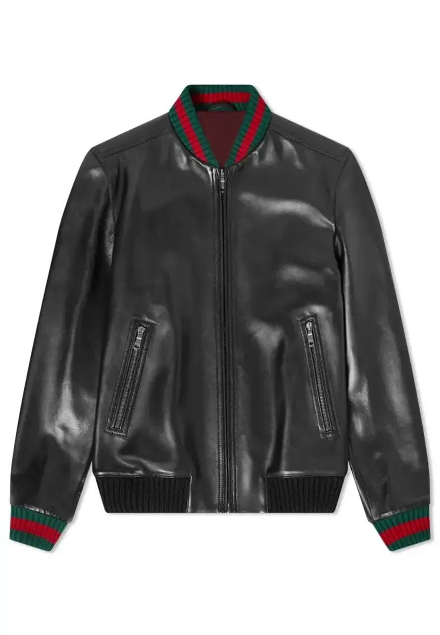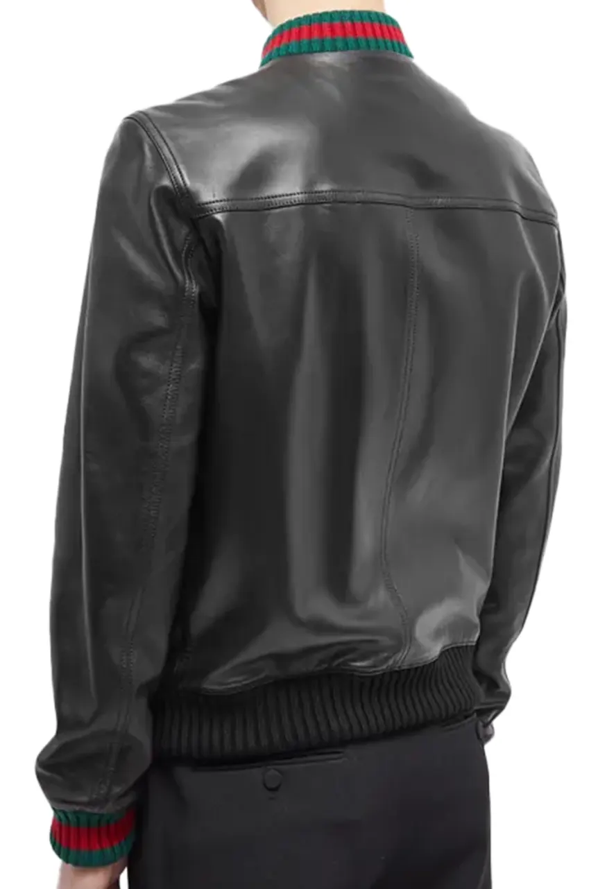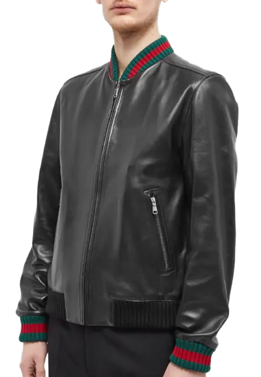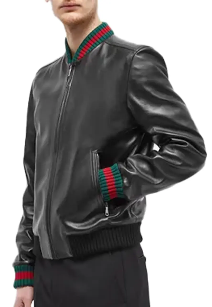 Men’s Ribbed Black Faux Leather Bomber Jacket