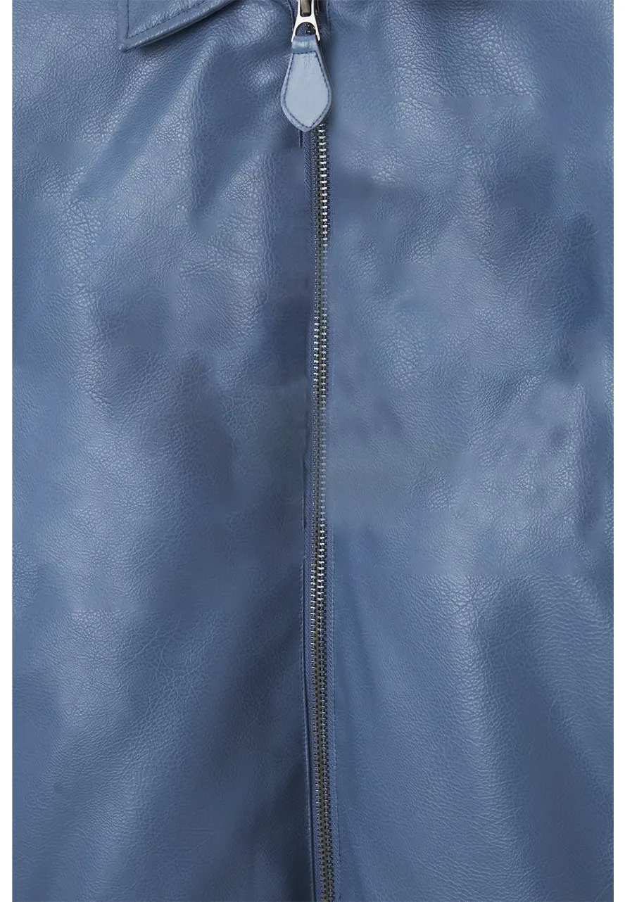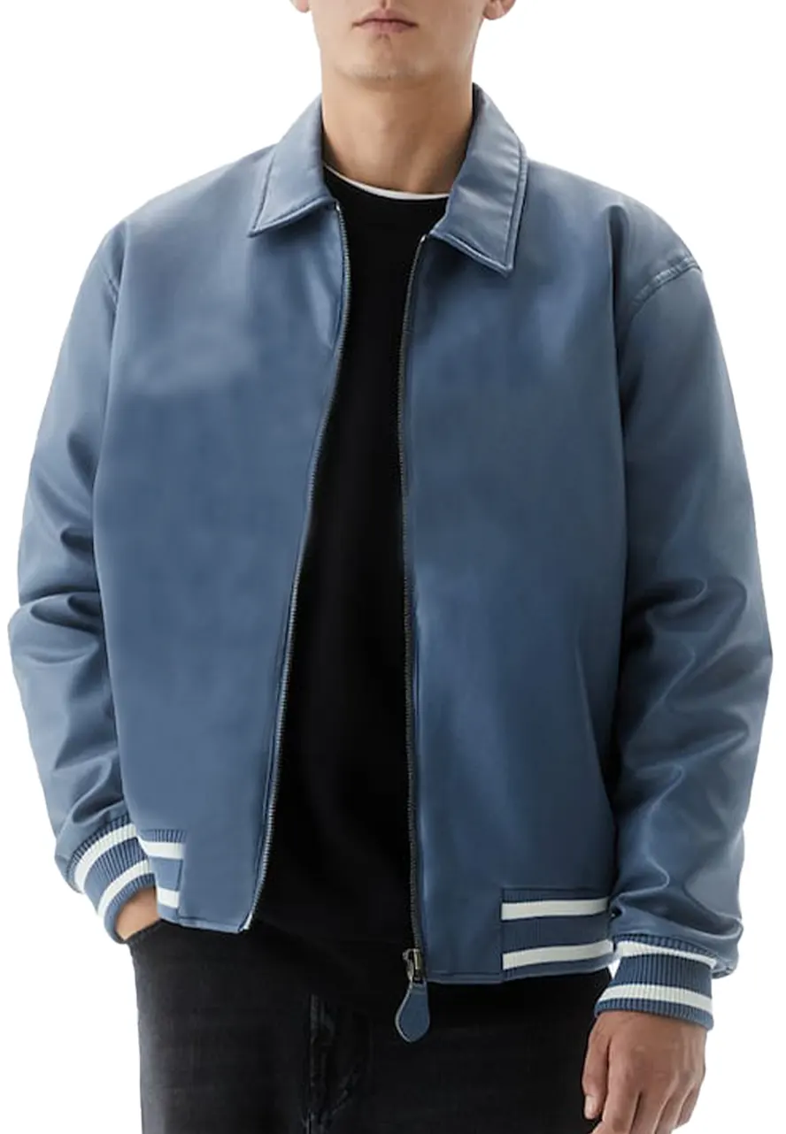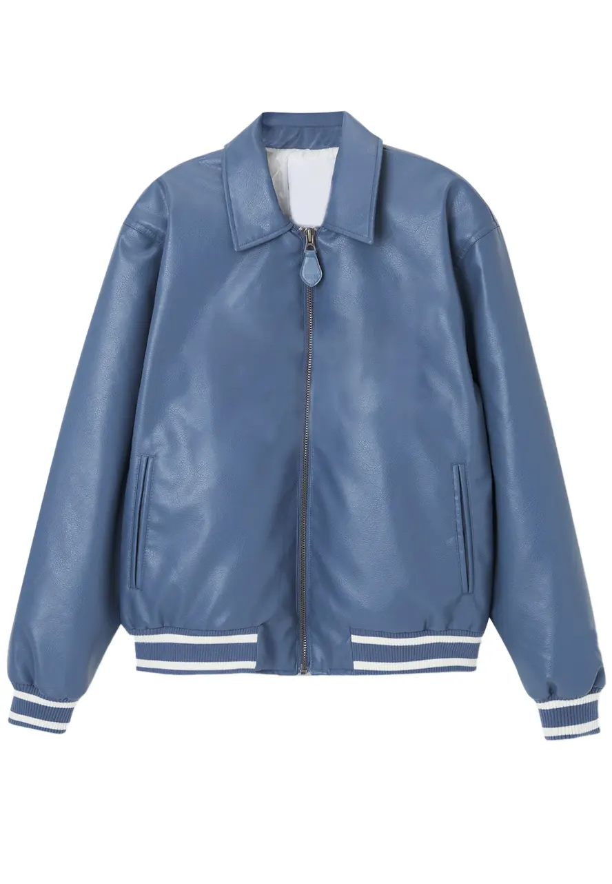 Men’s Shirt Collar Blue Bomber Faux Leather Jacket
