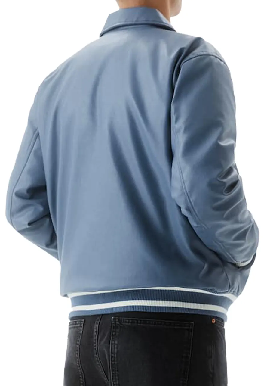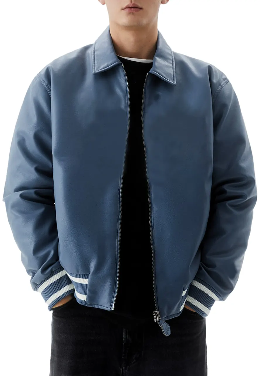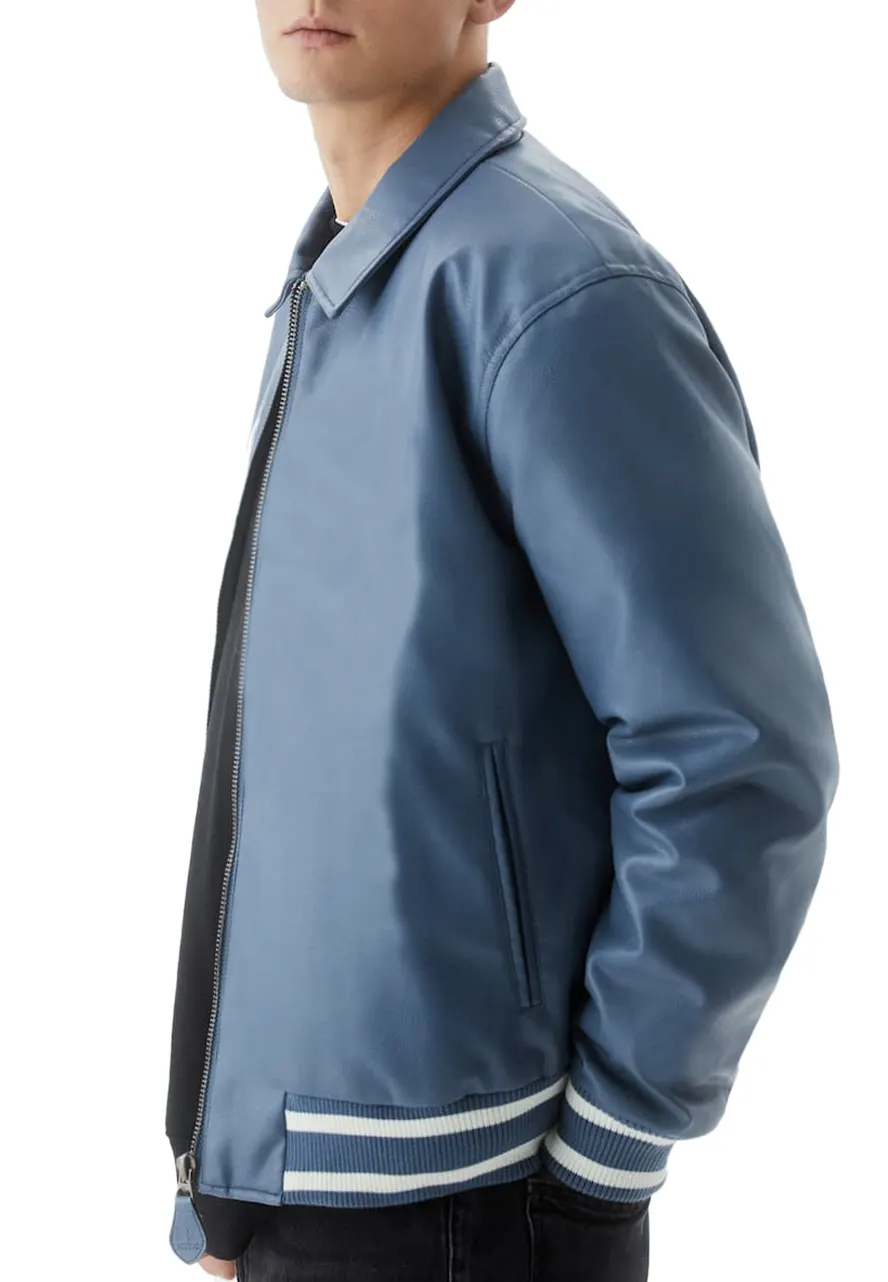 Men’s Shirt Collar Blue Bomber Faux Leather Jacket