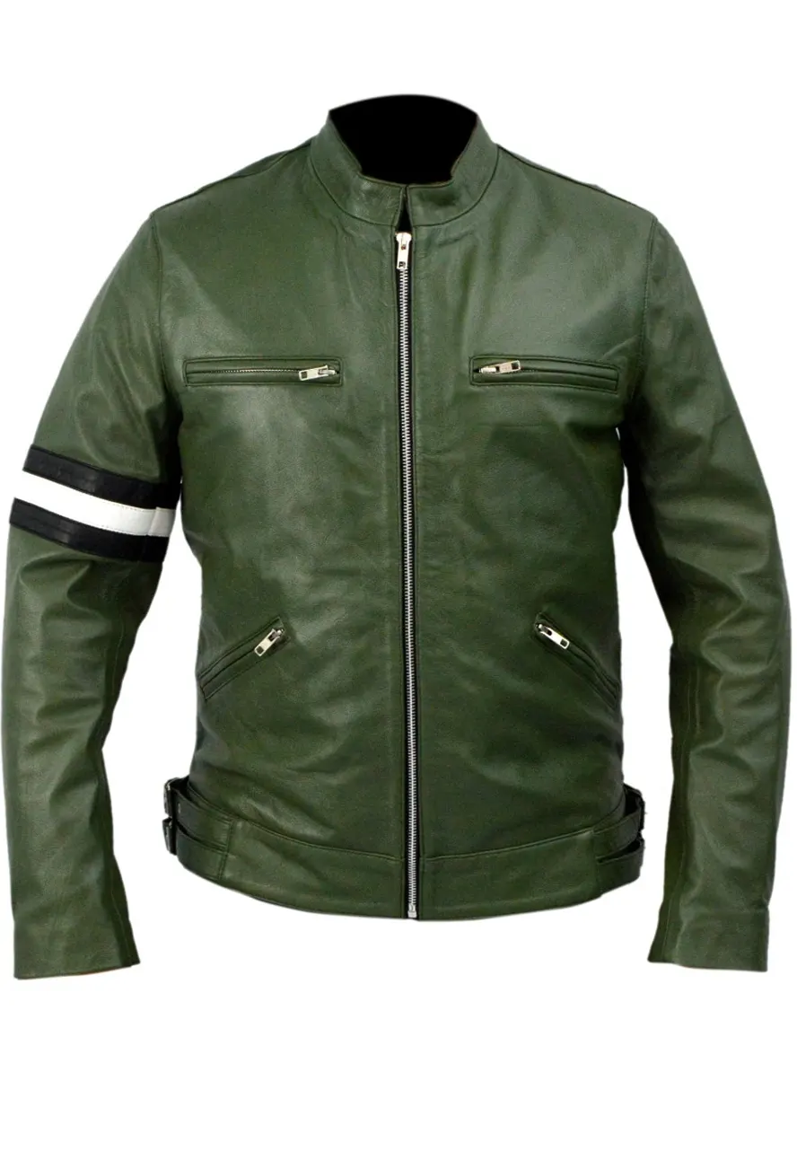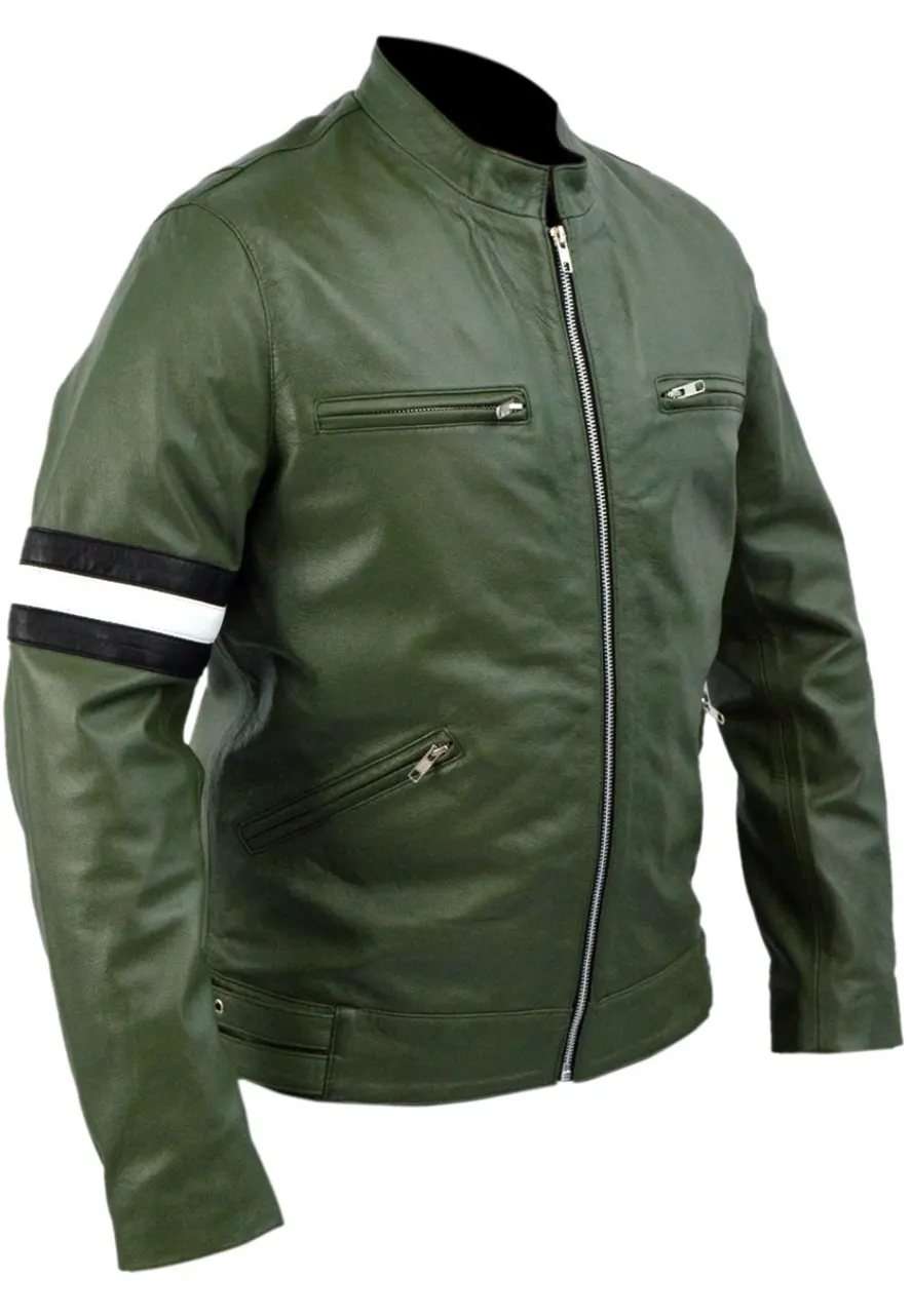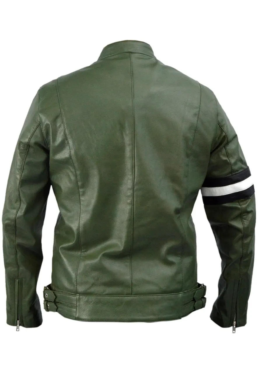 Men’s Stripe Dark Green Faux Leather Motorcycle Jacket