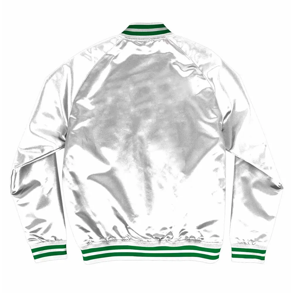 The New York Jets Satin jacket is a daring combination of high-end satin fabric and cutting-edge design that will let you unleash your inner style maverick. Its alluring green and white color scheme defies expectations, producing an unusual and mysterious look that is attention-grabbing. With its innovative asymmetrical collar that adds a dash of edgy sophistication, this jacket daringly reimagines what a collar is. Breaking out from the ordinary and embracing the extraordinary is symbolized by the branded YKK zipper front closure. The White New York Jets Satin jacket transcends fashion limitations and becomes a symbol of self-expression thanks to its silky viscose inner lining that envelops you in comfort.