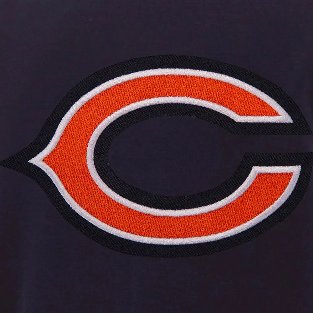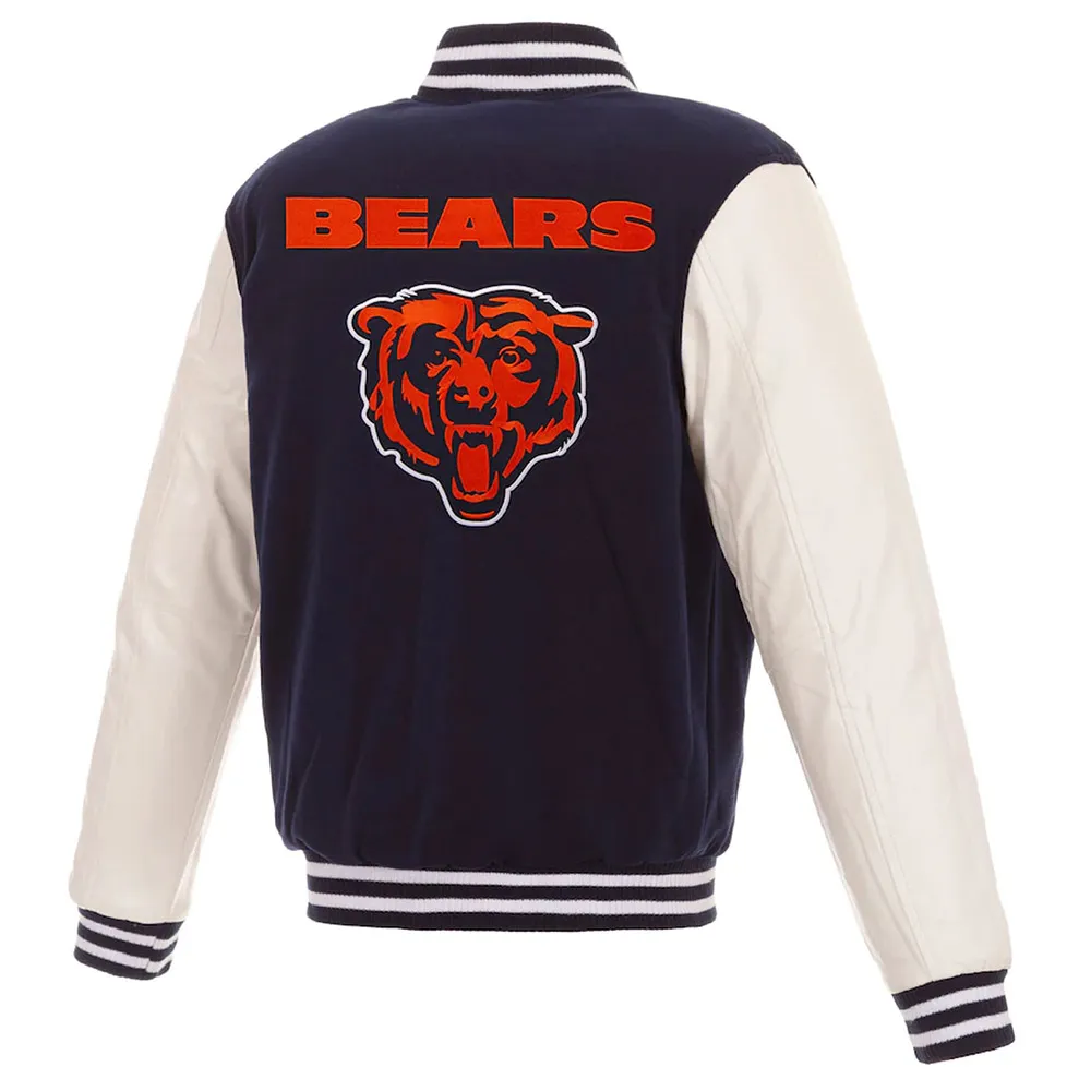 The Genuine leather sleeves with the wool body of the Navy/White Chicago Bears Varsity jacket. It is designed in an innovative, attractive color of navy blue and white. There is a shirt-style collar on the jacket. The jacket has a YKK branding zipper front closure. A soft viscose inner lining in the jacket keeps you warm and comfortable. Chicago Bears Varsity jacket Navy/White Two long sleeves with rib knitted cuffs. It has two inner pockets and two on the side. Navy/White Chicago Bears Varsity jacket’s stitching is of fine quality, which makes it comfortable and desirable to wear. This jacket is perfect for you to wear to parties.