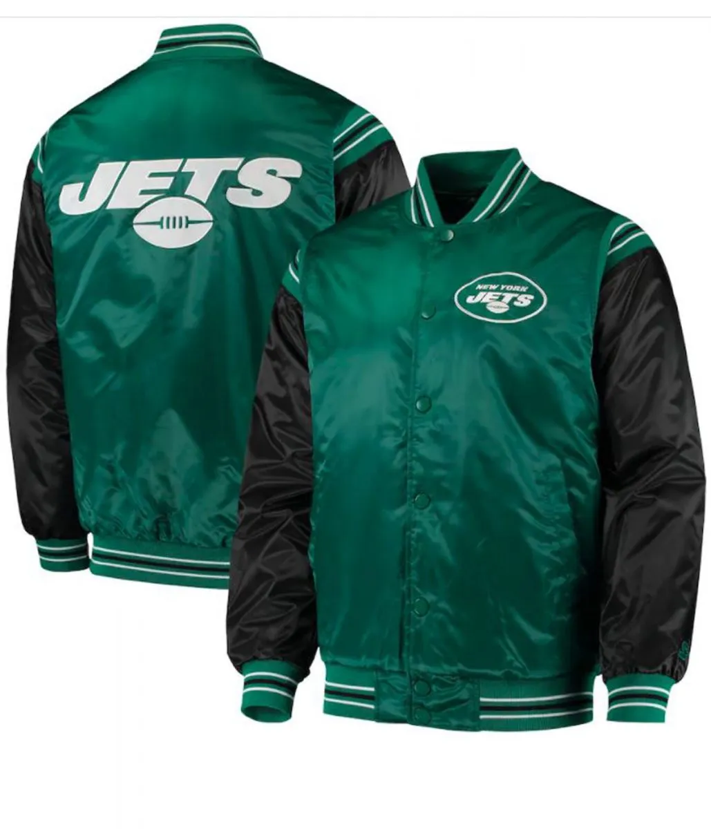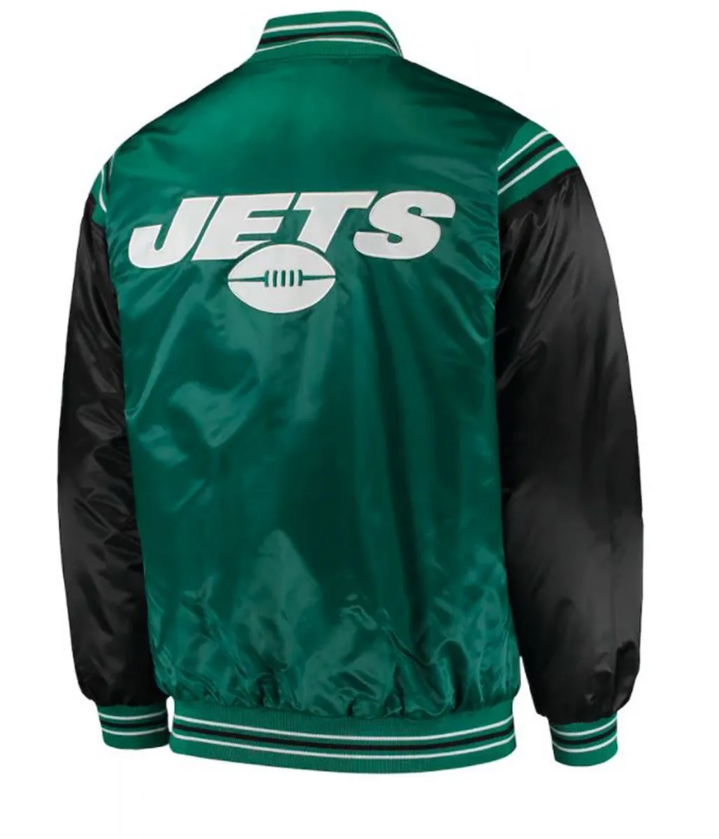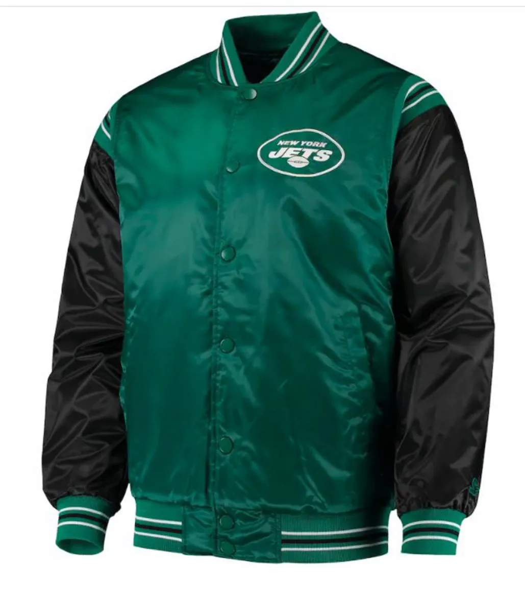 Show off your team spirit with bold, classic flair in the Starter NY Jets Full Snap Satin Green Bomber Jacket. Designed with a glossy satin exterior in a dynamic green and black combo, this jacket brings a modern edge to a timeless bomber silhouette. Whether you’re heading to the stadium or layering up for a casual night out, this piece makes a sharp statement.