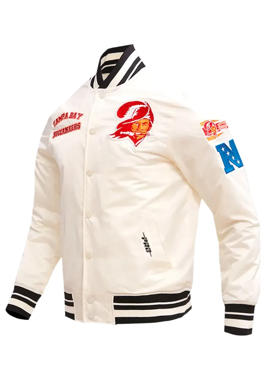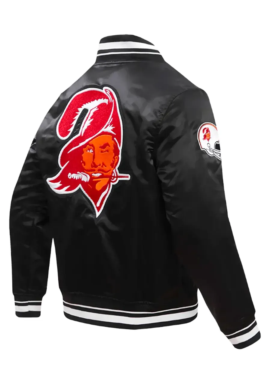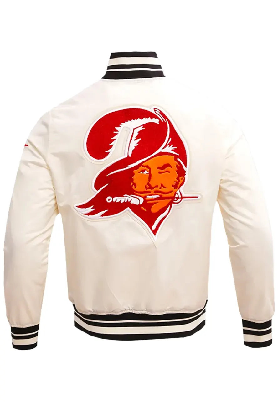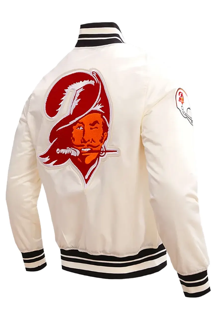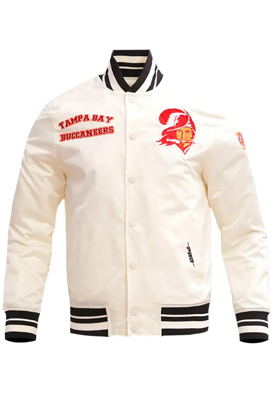Bring vintage vibes to modern game days with the Tampa Bay Buccaneers Full-Snap Retro Jacket. This sleek black and off-white satin bomber combines throwback style with team pride. The full snap button front and rib-knitted trim give it that classic varsity look, while the smooth satin finish adds a premium edge.
