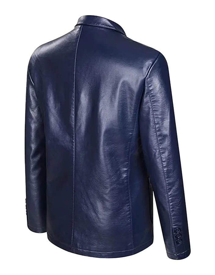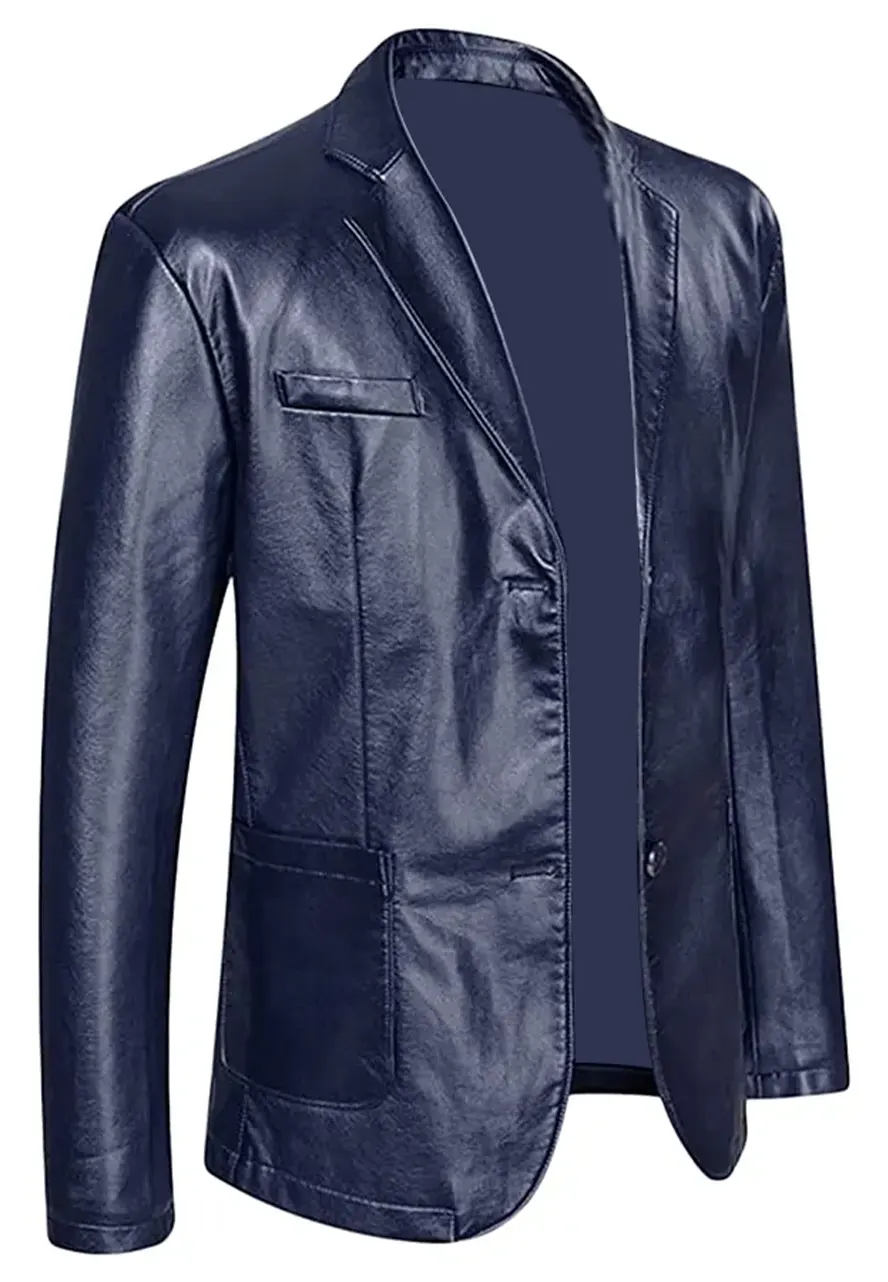 Two Button Men’s Classic Dark Blue Faux Leather Blazer