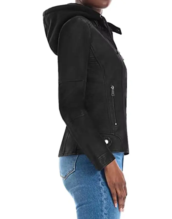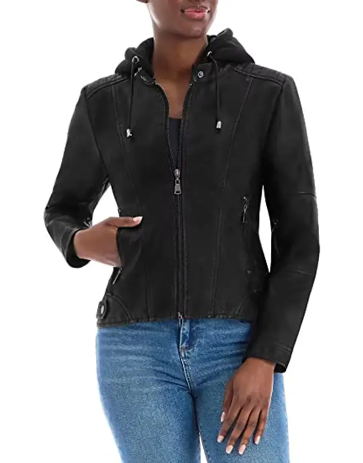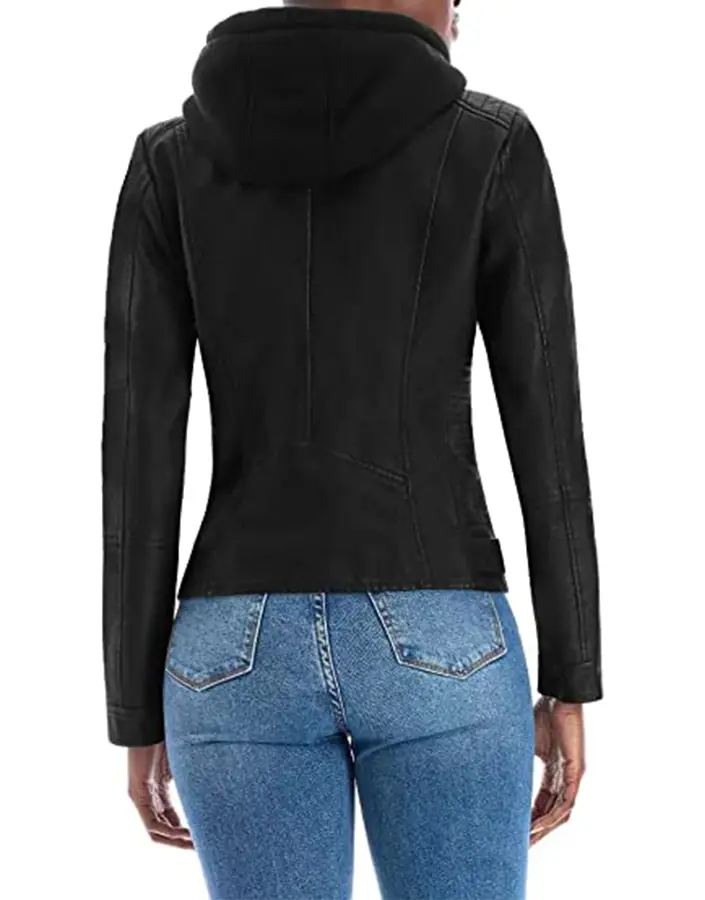 Stay fashionable and cozy this season in style with the black hooded jacket womens! This modern piece blends sleek faux leather material with the cozy comfort of a hood for ultimate chicness that works on any occasion. Designed with zip-up front closure and convenient pockets, its classic black hue guarantees versatility when matching it up with either casual or dressier ensembles, as its versatile zip-up front allows easy pairing across casual to formal looks without compromising style or functionality. Adding this chic piece will elevate both fashion and practicality seamlessly for transitional weather weather environments! Add one to your outerwear collection today and upgrade both aspects seamlessly.