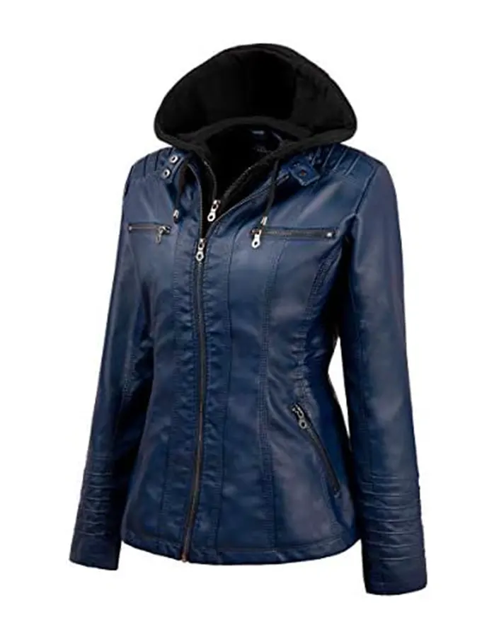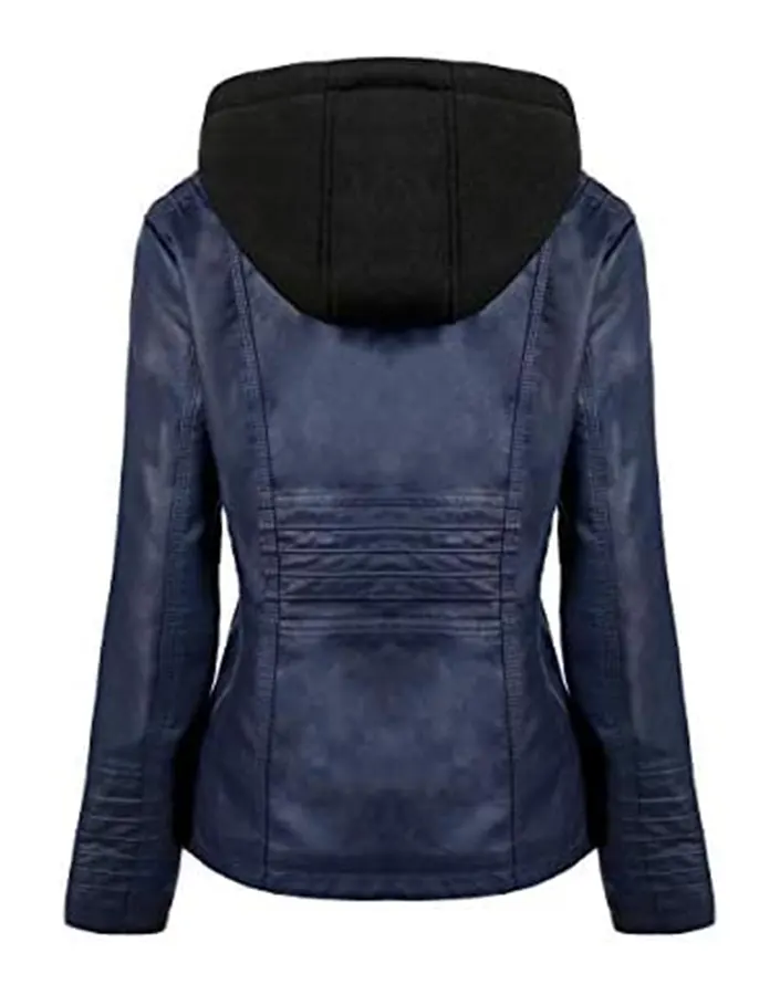 Women’s Navy Blue Faux Leather Jacket with Removable Hood