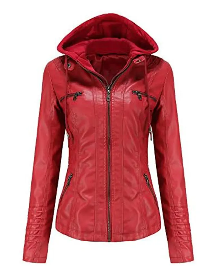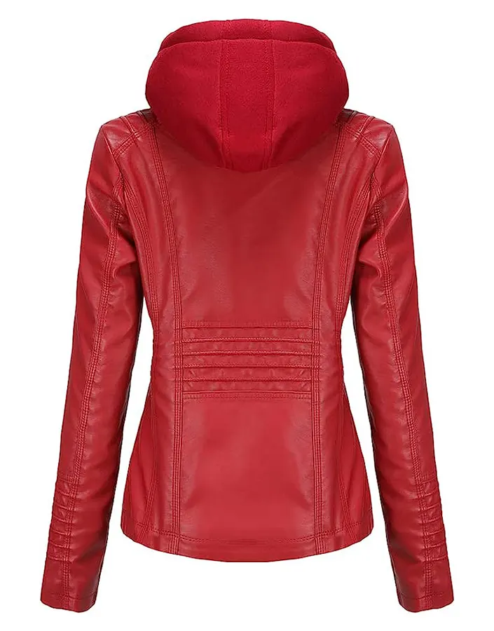 Boldly express your fashion sense with this stunning womens red jacket with hood! Featuring vibrant red faux leather that adds an eye-catching pop of color to any ensemble, the removable hood gives added flexibility allowing you to switch between sporty and elegant looks with ease. Crafted from high-quality faux leather for a durability yet a luxurious feel and complete with flattering fit features like front zip closure and functional pockets this piece combines practicality and striking style perfectly ideal for standing out.