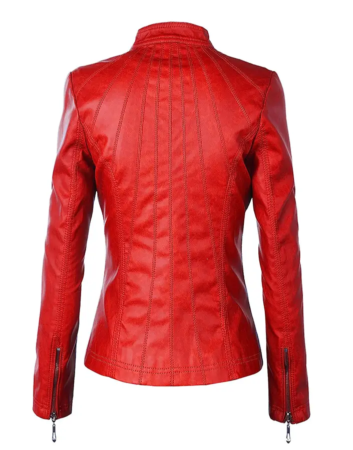 Women’s Red Faux Leather Slim Fit Zip Up Jacket