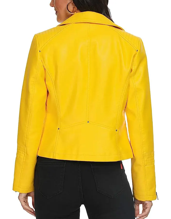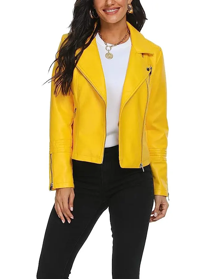 The Women’s Vegan Yellow Faux Leather Jacket is an absolute show-stopper! From the moment I laid eyes on it, I knew it would be a fabulous addition to my wardrobe, and it certainly did not disappoint.
