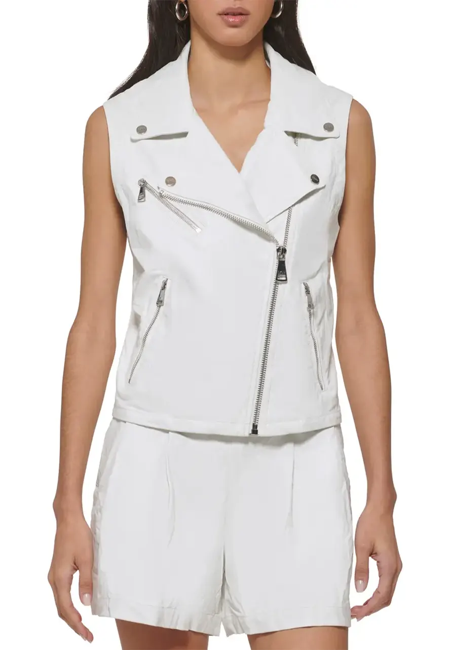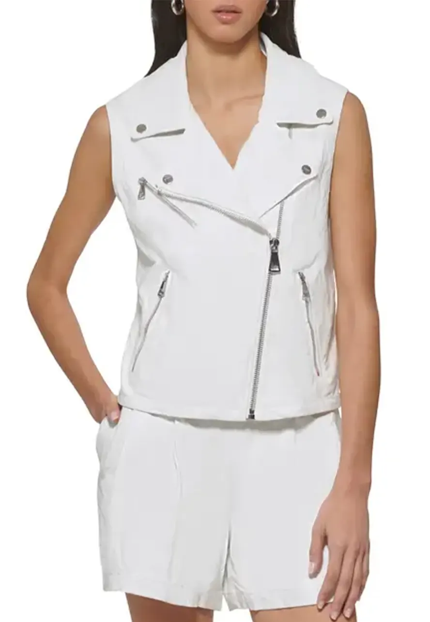 This white leather moto vest is ideal for layering. You can put on it over an easy tee or a comfortable sweater, depending on the climate. Its sleeveless layout makes it a tremendous choice for transitional seasons, including fashion without bulk.