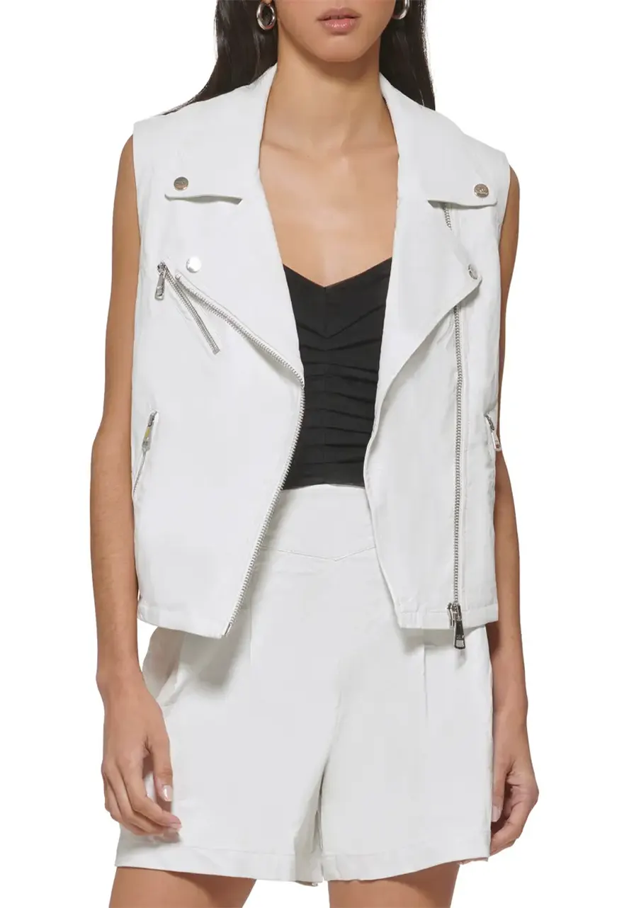 The white moto vest is a standout piece for all of us trying to add a hint of side to our wardrobe. This white faux leather vest is designed to make an announcement. Its crisp white color and asymmetrical zipper closure give it a modern and bold appearance.