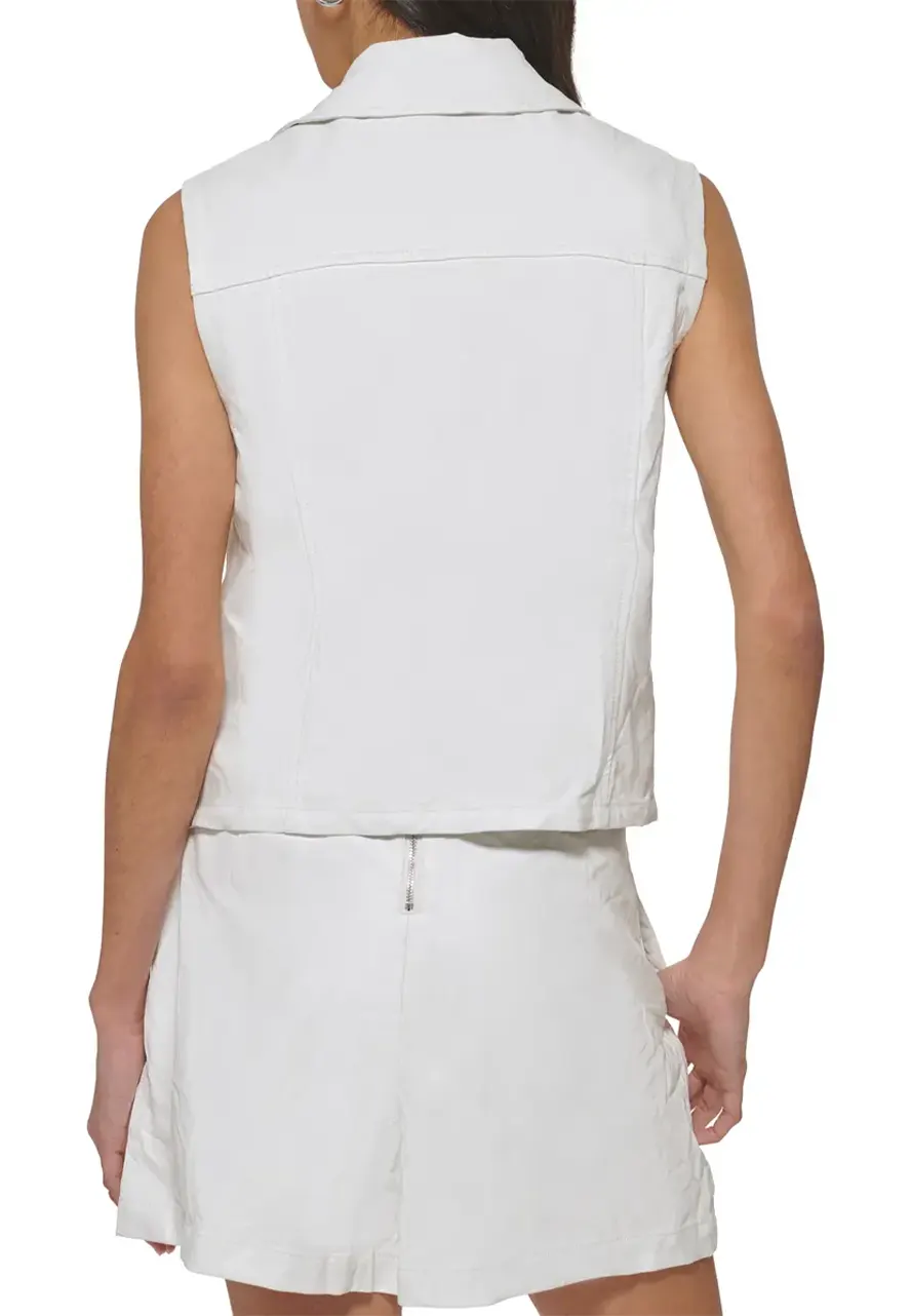 The white moto vest isn’t always just stylish, it’s also fairly purposeful. The asymmetrical zipper closure makes it smooth to put on and take off. The lapel collar can be worn up or down, depending on your preference.
